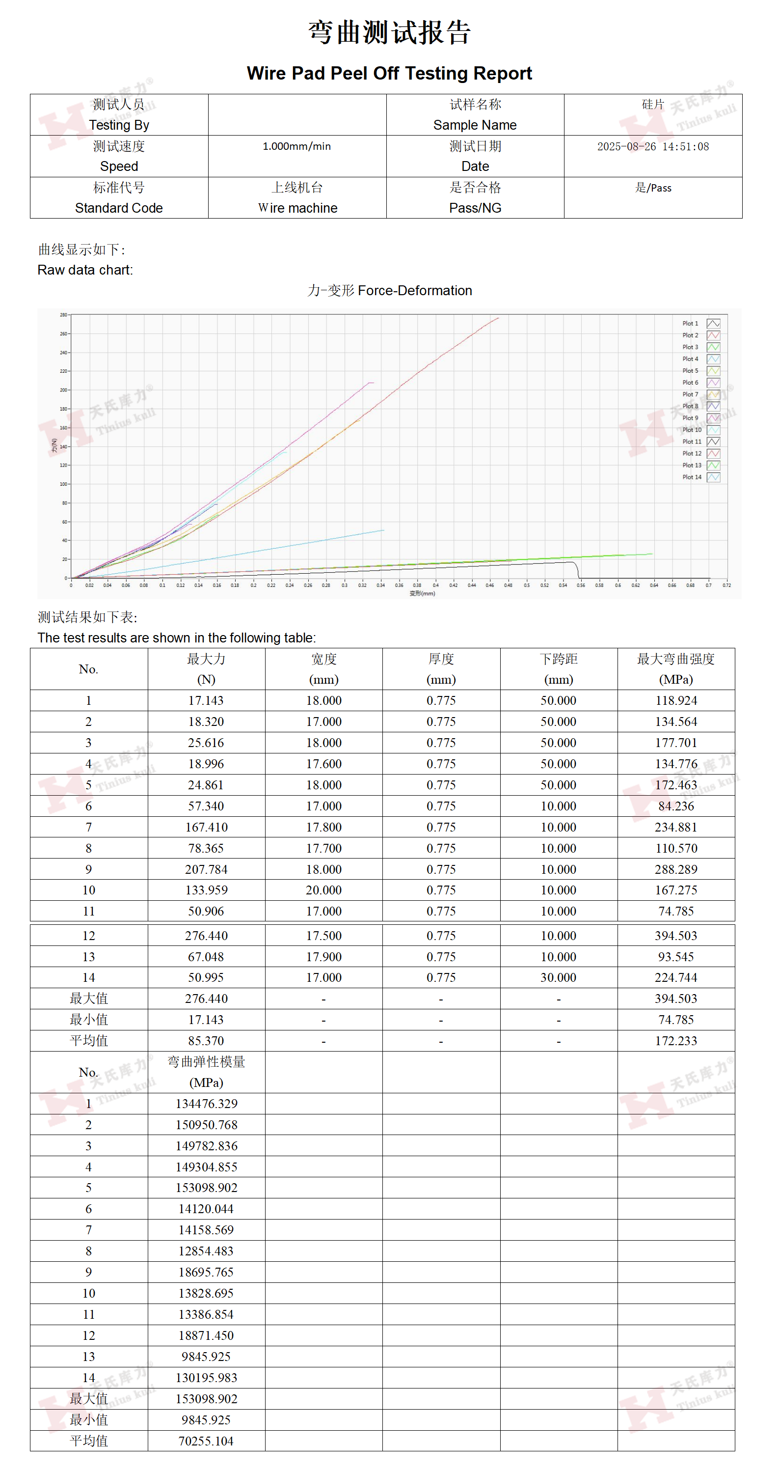 客戶采用了 TSKL-50D三點彎曲試驗機的立式彎曲測試模塊,對其生產的硅片進行了系統的三點彎曲試驗。該設備精度高、穩定性好,能精準繪制載荷-位移曲線并自動計算斷裂強度。