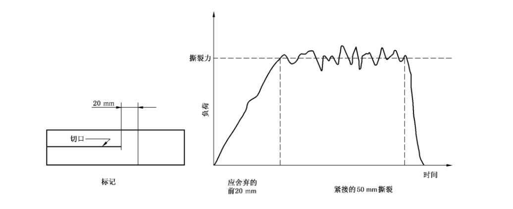 根據不同的測試方法,結果計算有所差異。褲形撕裂法應舍棄撕裂時未切口長度的前20mm以及最后5mm的負荷值,取其余50mm的未切口長度上撕裂負荷的平均值。當圖形的這部分為波浪平臺時,通過波浪曲線劃一條平行于橫軸的中線。讀取這一中線所對應的負荷,記作試樣的撕裂力。